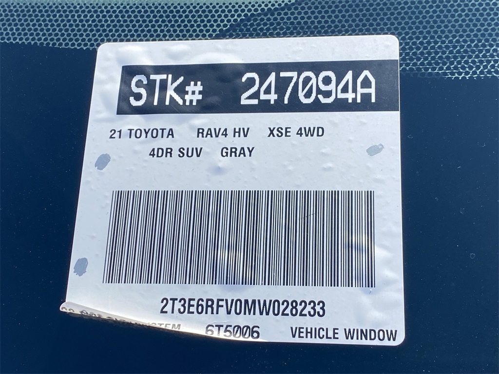 Looks and runs great. Good tires and brakes. Engine and transmission run smooth. Damage free. Immaculate inside and out. FREE CARFAX! We have great interest rate and financing for ALL credit situations.. Magnetic Gray Metallic/Midnight Black Metallic 2021 Toyota RAV4 Hybrid XSE AWD eCVT 2.5L 4-Cylinder 2.5L 4-Cylinder.