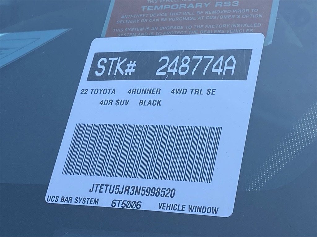 Looks and runs great. Good tires and brakes. Engine and transmission run smooth. Damage free. Immaculate inside and out. FREE CARFAX! We have great interest rate and financing for ALL credit situations.. Black 2022 Toyota 4Runner Trail 4WD 5-Speed with ECT 4.0L V6 DOHC 24V 4WD, Black/Graphite w/SofTex Seat Trim.