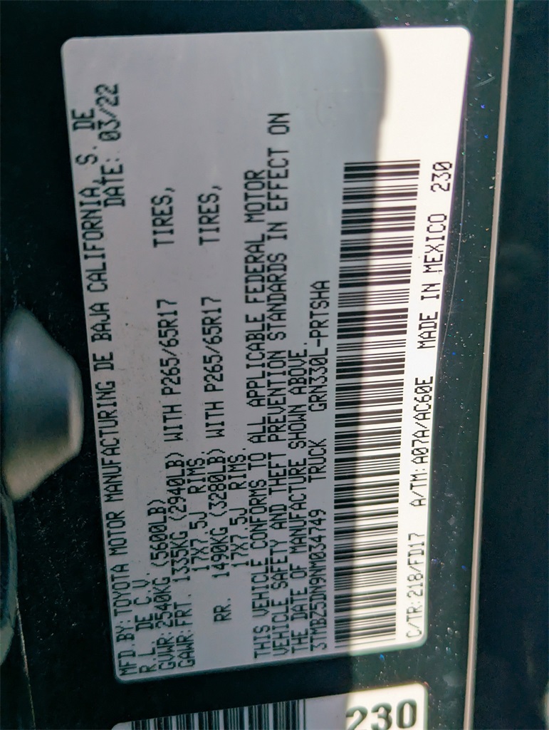 - VIN : 3TMBZ5DN9NM034749
