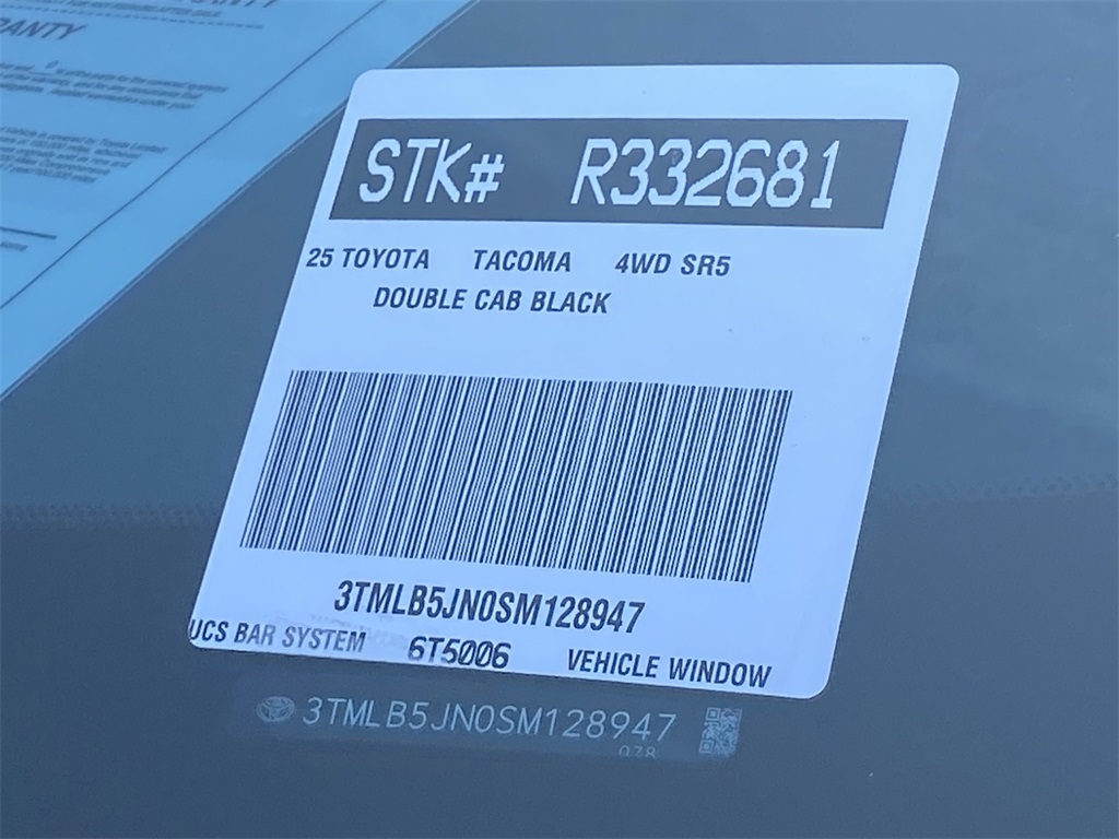 Looks and runs great. Good tires and brakes. Engine and transmission run smooth. Damage free. Immaculate inside and out. FREE CARFAX! We have great interest rate and financing for ALL credit situations.. Black 2025 Toyota Tacoma SR5 4WD 8-Speed Automatic 2.4L 4-Cylinder 4WD.
