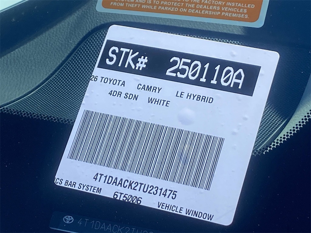 Looks and runs great. Good tires and brakes. Engine and transmission run smooth. Damage free. Immaculate inside and out. FREE CARFAX! We have great interest rate and financing for ALL credit situations.. White 2026 Toyota Camry LE FWD eCVT 2.5L 4-Cylinder 16V DOHC Black w/Fabric Seat Trim.